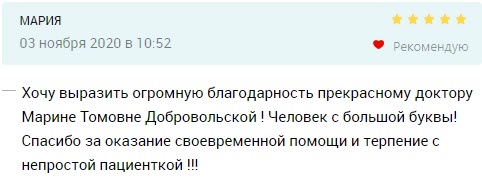 Хочу выразить огромную благодарность прекрасному доктору Марине Томовне Добровольской ! Человек с большой буквы! Спасибо за оказание своевременной помощи и терпение с непростой пациенткой !!!