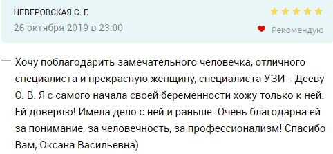 Хочу поблагодарить замечательного человечка, отличного специалиста и прекрасную женщину, специалиста УЗИ — Дееву О. В. Я с самого начала своей беременности хожу только к ней. Ей доверяю! Имела дело с ней и раньше. Очень благодарна ей за понимание, за человечность, за профессионализм! Спасибо Вам, Оксана Васильевна)