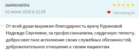 От всей души выражаю благодарность врачу Курановой Надежде Сергеевне, за профессионализм, сердечную теплоту, добросовестное исполнение своих служебных обязанностей, доброжелательное отношение к своим пациентам.